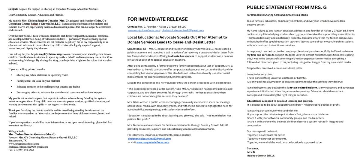 Hi, I’m Mrs. Chelsea Sanchez Gonzalez (Mrs. G) — an educator, advocate, and founder of Mrs. G’s Consulting Group: Raíces y Growth Ed, LLC, based in San Antonio, Texas.
