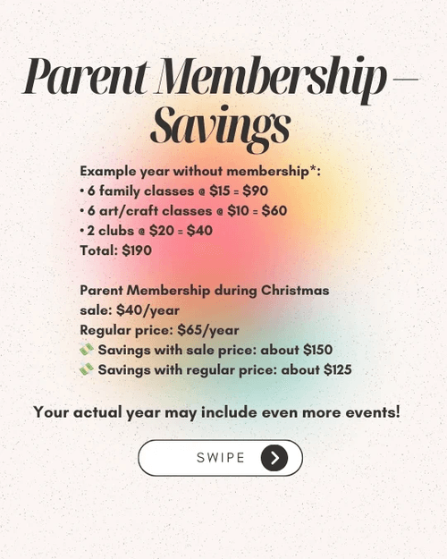 The Parent Membership supports families who regularly attend workshops, family classes, art sessions, and community clubs. Instead of paying for each event separately, your membership helps you save while staying connected all year long.
