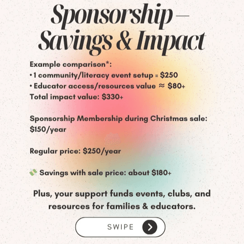 The Sponsorship Membership is for individuals or businesses who want to directly support literacy events, family programs, and educator resources—while receiving meaningful value in return.